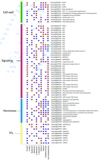 Receptors and signaling molecules play a crucial role in the capability of plants to respond adequately to specific stresses []. Our study found RLKs with divergent expression patterns during various stress. For example, Solyc06g048740 was induced by R genotypes to fungi and bacteria and repressed by R plants to TSWV. This gene was also upregulated in a tomato C. fulvum R genotype []. Moreover, Solyc07g006480 was exclusively activated by R plants to bacteria and repressed by fungi and TSWV R plants. This gene was also activated in salinity-tolerant plant roots []. Our results suggest that RLKs may play essential roles in fine-tuning the signaling process and their expression pattern can promote specific defense responses against different stressors. The Solyc04g014400, a Pseudomonas-responsive RLP gene [], also showed a common downregulation in all R genotypes, as well as Solyc11g056680 that was induced by potato cyst nematode (PCN) in tomato roots [], and could be involved in response to multiple pathogens.