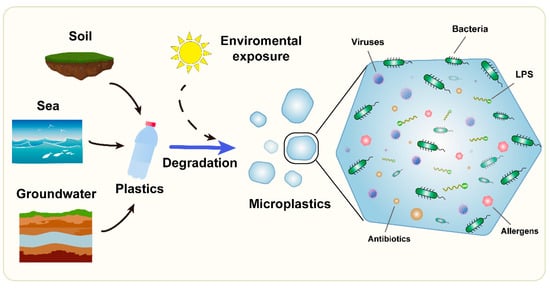 The widespread and substantial accumulation of discarded plastic products has changed the environment. The majority (almost 80%) of produced plastic is released into the environment, mainly through burial, direct disposal, and dumping in water bodies [1]. Discarded plastic can be found in the air, food, soil, and marine and freshwater environments, as well as in organisms living in these environments [2,3,4]. It has been estimated that more than 800 million tons of plastic enters the marine environment each year, and it can be expected that similar amounts are present in landfills and freshwater [5]. Microplastics (MPs) are plastic fragments smaller than 5 mm derived from the degradation of plastic products in natural environments (e.g., water and soil). MP intake by children and adults was calculated to be more than 500 and 880 particles per day, respectively [6]. MPs have an elevated ratio of surface area to volume, which enhances their ability to adsorb other substances [7,8]. Furthermore, the physical–chemical properties of MPs can substantially change with the weathering process (e.g., irradiation, erosion, etc.) [9,10], a process that can amplify and diversify the capacity of MPs to adsorb and transport different chemical contaminants [11,12] and biological agents present in the environment (e.g., viruses, bacteria, and allergens). Thus, microbial agents can be taken up by living organisms through ingestion or inhalation of MPs and even by dermal contact [2,10,13,14,15,16,17]. We expect that the biotic–abiotic association between MPs and microorganisms may change their interaction with the host barrier and defense mechanisms, including immune responses, in both environmental species and human beings. In this context, we will examine how associations with MPs can, on one hand, affect the intrinsic biological properties of microorganisms (e.g., bacteria, viruses, and their components) and, on the other hand, change the features of the interactions between microorganisms and cells of the immune system, thereby facilitating or hampering recognition and defensive reactivity.