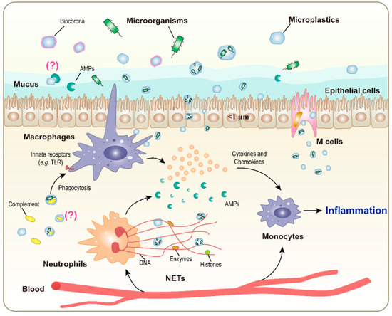 Innate immunity at the tissue barrier is the first immune defense mechanism to restrict and neutralize external threats, especially microorganisms and foreign particles that have overcome the mechanical and chemical barriers. In human beings, such barriers include surfactant and mucus (in the lungs and digestive system), stratum corneum (in the skin), flux generated by coordinated ciliary activity (in the respiratory tract), peristaltic movement (in the digestive system), low pH (in the stomach), and epithelial/mucosal layers. The vast majority of particles and microorganisms do not overcome these barriers, although MPs have been reported to cause alterations (for instance, by selective adsorption of some surfactant components) that can hamper organ functional integrity [48,49]. The entry and accumulation of MPs in organs generally depends on their concentration, size, and shape [14,15,50,51,52,53]. Size plays a substantial role in particle uptake. For example, compared with 20 μm MPs, 5 μm MPs can accumulate more abundantly in mouse intestines and kidneys [54]. Polystyrene (PS) MPs of 1 μm do not enter human or mouse hepatocytes, while 0.1 μm PS MPs are able to do so [53]. Likewise, cells of the human colon cancer cell line Caco-2 were shown to uptake more than 50% of PS MPs smaller than 1 μm in vitro, while larger particles were hardly taken up at all [55]. Thus, a limited number of inhaled/ingested particles actually come in contact with cells and factors of the innate immune system; they are most likely on the nanoscale. A similar situation may also occur in invertebrates. For example, in filter feeder marine invertebrates, the majority of large particles were expelled from the gut without having the opportunity to accumulate in tissues [56]. Smaller MPs have a larger surface area compared to larger particles, which may favor the carryover of toxic molecules (such as bisphenol A and BPA) [55] and, most likely, any other adhered molecules or microorganisms. Thus, the passage of microorganisms attached to small MPs may be facilitated, allowing them to overcome barriers and invade the underlying tissue. After overcoming the mechanical barriers, both types of foreign agents (MPs and microorganisms) can be sensed and tackled by innate immune mechanisms present in the affected tissue, particularly soluble factors, such as complement and antimicrobial peptides, and effector cells, such as macrophages, mast cells, and innate lymphoid cells [57]. If foreign agents induce an inflammatory reaction, then other innate effector cells, particularly neutrophils and monocytes, will be recruited from the blood.