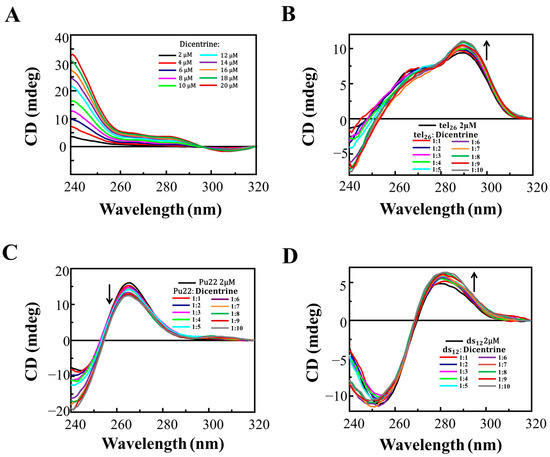 In detail, upon titration with Dicentrine, the tel26 G-quadruplex showed an increase in the CD signal intensity of the 290 nm band (Figure 1B), whereas, for the Pu22 G-quadruplex, a decrease in the intensity of the 265 nm band was observed (Figure 1C). Finally, the titration of ds12 with Dicentrine caused a slight increase in the intensity of the 251 nm band, accompanied by a dose-dependent increase in the 280 nm band (Figure 1D).
