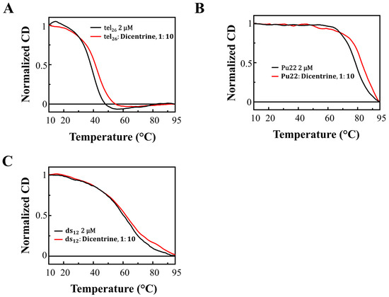 CD melting curves for (A) tel26 G-quadruplex, (B) Pu22 G-quadruplex and (C) ds12 duplex in the absence and presence of 10 molar equivalents of Dicentrine in 5 mM KCl, 5 mM KH2PO4, 5% DMSO buffer (pH 7), recorded at 290, 265 and 253 nm, respectively.