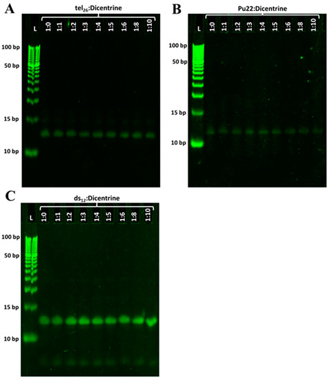 To obtain further information on the binding of Dicentrine to the G-quadruplex targets, gel electrophoresis experiments were carried out on tel26, Pu22 and ds12. Native polyacrylamide gel electrophoresis (PAGE) experiments were performed, analyzing the oligonucleotide samples at a 2 µM concentration mixed with different Dicentrine amounts (from 1:0 to 1:10 DNA/ligand ratio) in 5 mM KCl, 5 mM KH2PO4, 5% DMSO buffer (Figure 3). Furthermore, a step ladder was used as a size marker with 5 bp differences between adjacent DNA fragments.