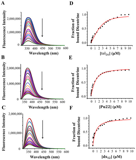 Left: Fluorescence emission spectra obtained by adding increasing amounts of (A) tel26 G-quadruplex, (B) Pu22 G-quadruplex and (C) ds12 duplex to 2 μM solutions of Dicentrine. Arrows indicate the fluorescence intensity changes upon increasing the DNA concentration. Right: Representative binding curves obtained by plotting the fraction of bound Dicentrine to (D) tel26 G-quadruplex, (E) Pu22 G-quadruplex and (F) ds12 duplex as a function of the DNA concentration. The black squares represent the data from a single experimental replicate; the red line represents the best fit obtained using an independent and equivalent-sites model.