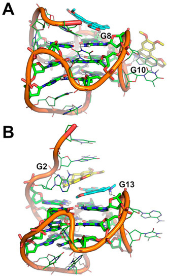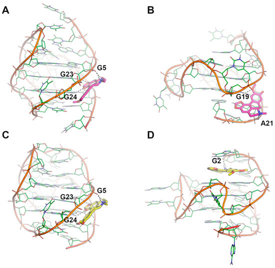 MD simulations of Pu22/Dicentrine interactions provided very interesting results. Indeed, while docking highlighted a putative binding site within the groove of the Pu22 G-quadruplex in proximity to G19 and T20, this site proved very unstable in MD simulations and was rapidly left by Dicentrine to move into the bulk solvent. However, the remarkable propensity of Dicentrine to bind the Pu22 G-quadruplex was highlighted by the fast transfer of the compound from the solvent to the G-quadruplex, where it preferentially recognizes the G-tetrad formed by G4, G8, G13 and G17 (Figure 6D). It is worth noting that this site was not accessible in docking simulations because it is occupied by A3 in the reference NMR structure used as a rigid receptor [39]. In MD simulations, Dicentrine displaces A3 and stacks on top of the G-tetrad in a sandwich-like conformation with G2 (Figure 6D,E). Additionally, Dicentrine interacts directly with the phosphate backbone of G2 and through water-bridged connections with G5 and G8 (Figure 6F). These results corroborate the relevance of MD simulations in the investigation of the binding mode of small molecules to G-quadruplex structures.