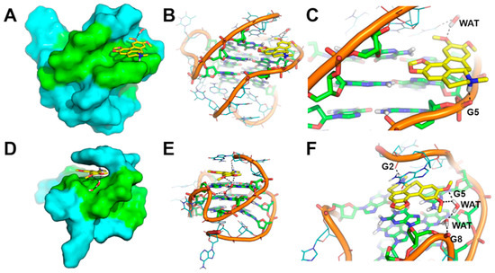 Representative MD structures describing the interaction between Dicentrine and tel26 and Pu22 G-quadruplexes. (A) Surface representation of tel26. (B) Cartoon representation of tel26. (C) Magnification of the binding mode of Dicentrine in the groove of tel26. (D) Surface representation of Pu22. (E) Cartoon representation of Pu22. (F) Magnification of the binding mode of Dicentrine on top of the G-tetrad of Pu22. Nucleotides from G-tetrads are colored green, other nucleotides are colored cyan. Dicentrine is shown as sticks and colored yellow. Water molecules bridging the ligand and G-quadruplexes are shown as sticks. Polar contacts are highlighted by black dashed lines. Nucleotides and water molecules (WAT) involved in polar interactions with Dicentrine are labeled in panels (C,F).