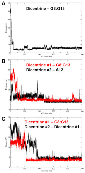 Plots of the distance between the mass center of Dicentrine and target nucleotides in MD simulations. (A) Distance between Dicentrine and the G8:G13 pair in the G-tetrad in the MD trajectory of the Pu22/Dicentrine complex with 1:1 stoichiometry. (B) Distance between Dicentrine #1 and the G8:G13 pair in the G-tetrad (red) and distance between Dicentrine #2 and the A12 mass center (black) in the first MD replica on the Pu22/Dicentrine complex with 1:2 stoichiometry. (C) Distance between Dicentrine #1 and the G8:G13 pair in the G-tetrad (red) and distance between Dicentrine #2 and the Dicentrine #1 mass center (black) in the second MD replica on the Pu22/Dicentrine complex with 1:2 stoichiometry.
