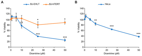 Effect of Dicentrine on cell viability. (A) BJ-EHLT (blue line) and BJ-hTERT (orange line) fibroblasts or (B) HeLa cells were treated for 72 h with increasing doses of Dicentrine (1, 5, 10, 25 and 50 µM) or with DMSO (negative control). Cell viability was determined with a colorimetric crystal violet assay. Results are expressed as the percentage of viable cells over the negative control. Histograms show the mean values ± SD of three independent experiments. * p < 0.05; ** p < 0.01; *** p < 0.001.