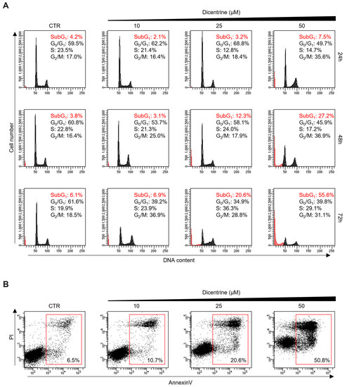 In parallel, the effect of Dicentrine on cancer cells was also evaluated using a fluorescence-associated cell sorter (FACS). Interestingly, time-course cell cycle analyses (from 24 to 72 h) showed that the treatment of HeLa cells with different doses of Dicentrine (10, 25 and 50 µM) promoted time- and dose-dependent cell cycle arrest, evidenced by the accumulation of cells in the G2/M phase (Figure 10A). In addition, FACS analyses showed the appearance of a subG1 peak, indicative of the capability of Dicentrine to induce cell apoptosis in treated cells (Figure 10A). Moreover, Annexin V analyses confirmed the capability of Dicentrine to induce apoptosis in treated HeLa cells, reaching about 20% and 50% of Annexin V-positive cells upon treatment with 25 and 50 µM of Dicentrine for 72 h, respectively (Figure 10B).