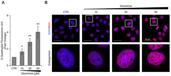 In order to investigate the mechanisms by which Dicentrine promotes apoptosis in cancer cells, additional in vitro tests were carried out. In more detail, the capability of Dicentrine to stabilize G-quadruplex structures in cells was evaluated. For these experiments, HeLa cells were treated with different doses of Dicentrine (10, 25 and 50 µM) and, after 24 h of treatment, the G-quadruplex structures—detected with a specific antibody—were evaluated using immunofluorescence (IF) microscopy. In agreement with the biophysical results, Dicentrine was found to promote, in a dose-dependent manner, the stabilization of G-quadruplex structures in tumor cells (Figure 11).