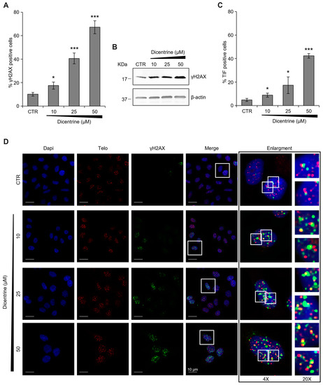 Additionally, considering that the antitumor activity of G-quadruplex ligands is mainly due to their capability to induce DNA damage, the amount of phosphorylated histone H2AX (γH2AX), a typical hallmark of DNA double-strand breaks [40], was evaluated in the cells treated with Dicentrine. Interestingly, complementary technical approaches, based on both confocal microscopy (IF) and biochemical (Western blot) analyses, evidenced a robust increase in γH2AX levels in Dicentrine-treated cells compared with their untreated counterparts (Figure 12A,B), highlighting the efficacy of the treatment in inducing DNA damage in tumor cells. For completeness, we then evaluated whether Dicentrine-induced DNA damage was localized at the telomeres. Thus, a fluorescence in situ hybridization (FISH) assay was performed, aimed at defining the number of γH2AX spots colocalizing with a fluorescent telomeric probe (Telomere Induced Foci, TIF). Interestingly, quantitative confocal analyses evidenced that Dicentrine promotes a dose-dependent increase in the percentage of TIF-positive cells (TIF ≥ 4), thus demonstrating the effective activity of this G-quadruplex ligand at the telomeres (Figure 12C,D).