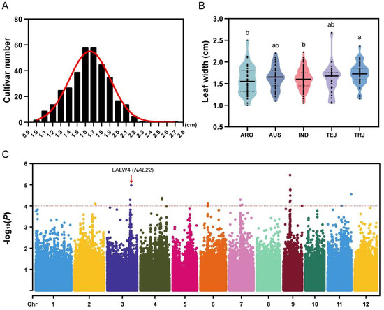 LW variation in the RDP-II population and corresponding GWAS results. (A) The LW variation distribution in the RDP-II population. The X-axis represents LWs, and the Y-axis represents the number of accessions with the LW interval. (B) LW variation in the subpopulations. Each dot represents a rice accession in the subpopulation. Black lines represent the average value of LWs in the five subpopulations. “a” and “b” represent significant differences (p < 0.05) of the leaf width among different subpopulations. (C) GWAS of the LW variation using the RDP-II population and 700,000 SNP maps. The X-axis represents 12 rice chromosomes, and the Y-axis represents the converted p-value (−log10(P)). The dotted line represents the threshold of candidate SNPs, and the dots above that line are candidates. The dot marked with a red arrow represents the LALW4.