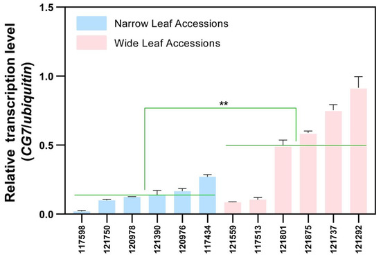 The transcription level of CG7 was positively associated with rice leaf width. Blue bars indicate accessions with narrow leaves (<1.3 cm); pink bars indicate accessions with wide leaves (>2 cm). “**” represents significant differences (p < 0.01) of the transcription level of CG7 between wide leaf accessions and narrow leaf accessions.