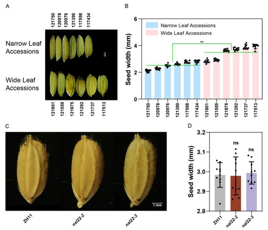 A previous study showed a correlation between leaf width and seed width in different rice varieties [27]. Therefore, we first examined whether there was a similar correlation in RDP-II. The seed widths of 12 accessions used for gene sequencing were measured under a microscope. Four of the six wide-leaf accessions had wider seeds, whereas four of the six narrow-leaf accessions had narrower seeds (Figure 5A,B). However, the seed widths of the nal22 mutants were measured and we found no significant difference compared with the WT (Figure 5C,D). The average seed widths of the WT and nal22 mutants were 2.98 ± 0.06 mm, 2.98 ± 0.09 mm, and 2.99 ± 0.05 mm, respectively. This suggested that NAL22 regulates leaf width but not seed width.