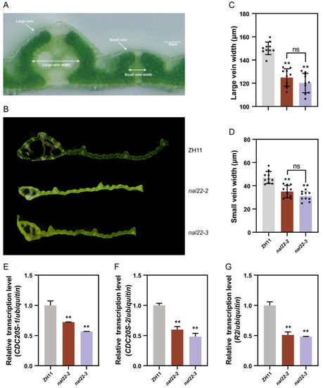 NAL22 affected the vein width and transcription level of genes related to cell division. (A) Schematic and diagram of large veins, small veins, large vein width and small vein width. (B) Transverse sections of the mature second leaves of wild-type and nal22 mutants. Bar = 500 μm. (C,D) Bar diagram of large vein width and small vein width. (E–G) Bar diagram of transcription level of CDC20S-1, CDC20S-2, and R2. Gray bars indicate ZH11; red bars indicate nal22-2; purple bars indicate nal22-3. Black bars indicate the difference between two nal22 mutants. “**” represents significant differences (p < 0.01), and “ns” represents no significant difference.