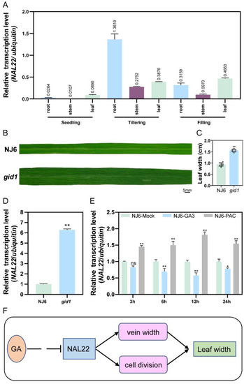 NAL22 was negatively regulated by GA. (A) The transcription level of NAL22 in different tissues. “Seedling, tillering and filling” indicate different growth stages. The number above the column indicates the transcription level of NAL22 relative to ubiquitin. (B) Leaf-width phenotype of NJ6 (wild type of gid1) and gid1. Bar = 5 mm. (C) Bar diagram of leaf width of NJ6 and gid1. (D) The transcription level of NAL22 in NJ6 and the gid1 mutant. (E) Transcription level of NAL22 under water, GA3 and PAC treatment at different time points. (F) The proposed model for NAL22 mediating leaf width in rice. This model shows that NAL22 promotes rice leaf width by affecting vein width and cell division, while GA suppresses NAL22. The concentrations of GA3 and PAC were 100 μmol L−1. “*” represents significant difference (p < 0.05). “**” represents significant difference (p < 0.01), and “ns” represents no significant difference.