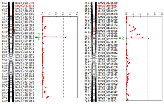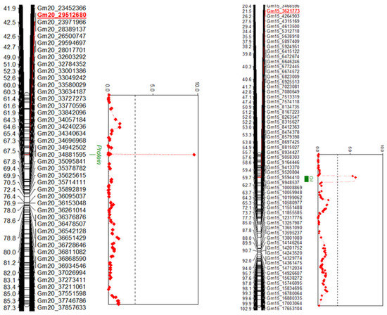 On the other hand, in the BC1F2:3 population, QTLs for protein and oil content were both identified on chromosome 20 (Figure 4), accounting for 15.8% and 10.7% of the phenotypic variation, respectively, with additive effects of the alleles on these traits of −1.49 and 0.62 (Table 6).