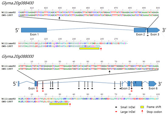 Of these, large InDels were identified in five genes (Glyma.20G085300, Glyma.20G085450, Glyma.20G085800, Glyma.20g087000, and Glyma.20G088000), small InDels were most common in 40 loci in Glyma.20G085300, and three large InDels were present in Glyma.20G088000. In particular, InDels occurred in the exon region of genes Glyma.20g088000 and Glyma.20g088400, and the InDels of the two genes generated stop codons with amino acid frameshifts (Figure 5).