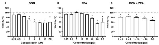 Viability of HepG2 cells (assessed by the MTS assay) after 24 h exposure to (a) deoxynivalenol (DON), (b) zearalenone (ZEA) or (c) their combinations (DON + ZEA). PC—positive control (30 μg/mL etoposide). * different from control, p < 0.05 (ANOVA; Dunnett’s multiple comparison test).