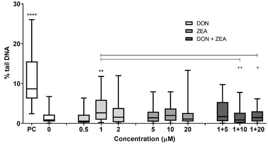 DNA strand breaks in HepG2 cells (assessed by the alkaline comet assay) after 24 h exposure to deoxynivalenol (DON), zearalenone (ZEA) or their combinations (DON+ZEA). 0—solvent control (0.1% DMSO), PC—positive control (30 μM B[a]P). ** different from control, p < 0.01; **** different from control, p < 0.001; + different from DON (1 µM), p < 0.05; ++ different from DON (1 µM), p < 0.01 (ANOVA; Scheffe’s multiple comparison test).