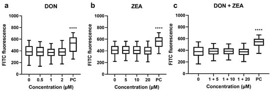 DNA double-strand breaks in HepG2 cells (assessed by the γ-H2AX formation using flow cytometry) after 24 h exposure to (a) deoxynivalenol (DON), (b) zearalenone (ZEA) or (c) their combinations (DON + ZEA). 0—solvent control (0.1% DMSO), PC—positive control (1 μg/mL etoposide). **** different from control, p < 0.001 (Mixed Effects Models (nlme) by REML).