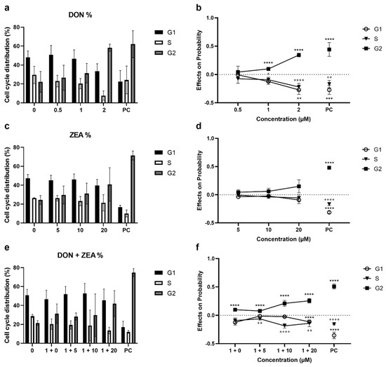 Distribution of HepG2 cells across the cell cycle phases (assessed by flow cytometry) and calculated effects of predicted probabilities with 95% Cls after 24 h exposure to (a,b) deoxynivalenol (DON), (c,d) zearalenone (ZEA) or (e,f) their combinations (DON + ZEA). 0—solvent control (0.1% DMSO), PC—positive control (1 μg/mL etoposide). ** p < 0.01 G1 different from control; *** p < 0.001 G1 different from control; + p < 0.05, ++ p < 0.01 S different from control; ++++ p < 0.001 S different from control; **** p < 0.001 G2 different from control (multinomial logistic regression).