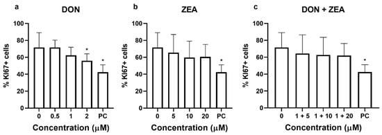 Proliferation of HepG2 cells (assessed by the level of Ki67 protein using flow cytometry) after 24 h exposure to (a) deoxynivalenol (DON), (b) zearalenone (ZEA) or (c) their combinations (DON + ZEA). 0—solvent control (0.1% DMSO), PC—positive control (1 μg/mL etoposide). * different from control, p < 0.05 (ANOVA; Dunnett’s multiple comparison test).