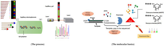 The Sanger sequencing method, also known as the “chain termination sequencing method”, synthesizes a strand complementary to the template strand. This sequencing method requires DNA polymerase, a primer, and all four deoxynucleotide triphosphates (dNTPs): deoxy-adenosine triphosphate (dATP), deoxy-guanin triphosphate (dGTP), deoxy-thymine triphosphate (dTTP), and deoxy-cytosine triphosphate (dCTP). During strand synthesis, DNA polymerase binds the phosphate group of the subsequent nucleotide to the hydroxyl group on the 3′ carbon of the ribose sugar of the pre-existing nucleotide (Figure 1 The process). This hydroxyl group is absent in di-deoxy-nucleotide triphosphates (ddNTPs), meaning that no further elongation can occur where a ddNTP is incorporated into the nascent DNA, resulting in fragments of various lengths with different terminal ddNTPs. Using ddNTPs with radioactive or fluorescent labels makes it possible to visualize the sequence on a gel [66,67,68,69].