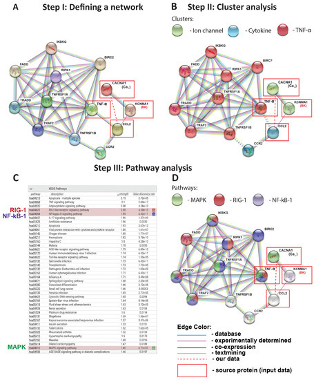 Protein-protein interaction (PPI) prediction model (STRING): (A) By entering KCNMA1 (BK channel), CACNA1 (CaV channel), TNF-α, and CCL2 as query proteins (in red boxes), the STRING PPI network model reveals the nine most likely downstream interaction partners with the confidence level set to “high” (0.8 on a 0–1 scale). (B) STRING model of cluster analysis using K-MEANS algorithm to categorize each protein molecule into a determined sub-cluster: Ion channel, Cytokine, TNF-α pathway. (C,D) KEGG pathway analysis in STRING, highlighting relevant pathways in red (RIG-1), blue (NF-kB-1), and green (MAPK). The “strength” reflects the score of integrated, publicly available PPI information: the higher the “strength” number, the more likely this pathway is present in the model. “False discovery rate” (FDR) is based on a statistical approach used in high-throughput experiments to correct for random events that falsely appear significant: the lower the FDR, the more likely a pathway is involved in a given network. All proteins in this figure are labeled with their gene names, as is conventional in this field. The red dashed line depicts the association between CaV channels and CCL-2 identified in this study.