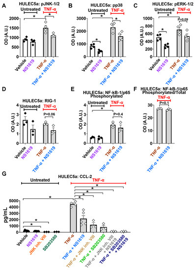 BK channel activation inhibits TNF-α-induced MAPK but not NF-kB-1/p65 or RIG-1 pathways. The treatment of HULEC5a endothelial cells with the BK channel opener NS1619 (30 µM, for 24 h) inhibits the TNF-α-induced (5 ng/mL; 24 h) phosphorylation of the Ca2+-dependent JNK-1/2 (A) and p38 pathways (B), but has no effect on RIG-1 expression or the phosphorylation of ERK-1/2 and NF-kB/p65 (C–F) (n = 3–4, * p ≤ 0.05) as shown by ELISA-based multiplex assays. (G) The inhibition of JNK-1/2 (JNK inhibitor VIII, 20 µM, 24 h) and p38 (SB203580, 20 µM, 24 h) pathways, with or without NS1619, decreases TNF-α-induced (5 ng/mL; 24 h) CCL-2 secretion from HULEC5a cells (n = 3–4, * p ≤ 0.0001), shown by ELISA. n = number of separate cell passages, which are considered biological replicates.