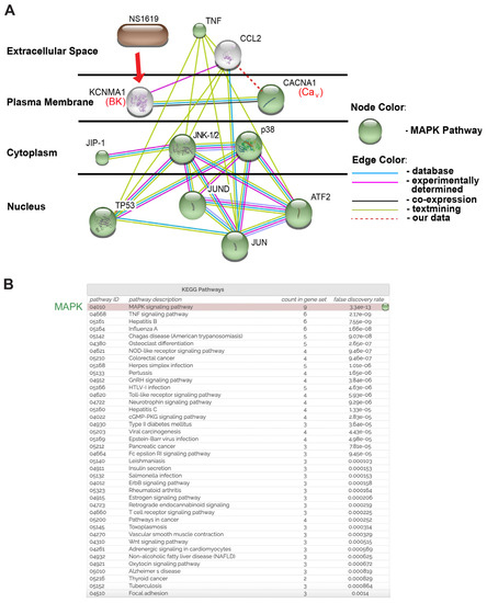 To explore the interactions between the chemical NS1619 and target proteins, we input our experimentally defined protein queries (BK channels, CaV channels, TNF-α, CCL-2, JNK-1/2, and p38) and the chemical NS1619 as entry points into STITCH (www.stitch.embl.de; accessed on 15 April 2022, version 5.0). This database integrates information about interactions from metabolic pathways, crystal structures, binding experiments, and drug–target relationships. Inferred information from phenotypic effects, text mining, and chemical structure similarity is used to predict relations between chemicals and proteins [44]. We defined interactions between the initial cluster and 5 downstream partners, and a “high” interaction score of 0.7 (range 0–1) was considered significant. KEGG pathway enrichment analysis in STITCH was used to define the top candidate signaling pathways.