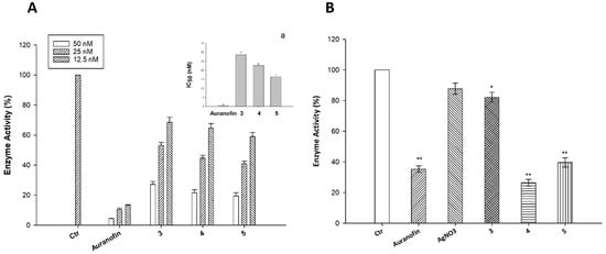 - Marzano, C.; Gandin, V.; Folda, A.; Scutari, G.; Bindoli, A.; Rigobello, M.P. Inhibition of thioredoxin reductase by auranofin induces apoptosis in cisplatin-resistant human ovarian cancer cells. Free Radic. Biol. Med. 2007, 42, 872–881. [Google Scholar] [CrossRef]