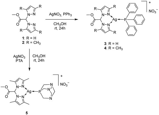 - Pellei, M.; Alidori, S.; Papini, G.; Lobbia, G.G.; Gorden, J.D.; Dias, H.V.R.; Santini, C. Silver(i)-organophosphane complexes of electron withdrawing CF3- or NO2-substituted scorpionate ligands. Dalton Trans. 2007, 42, 4845–4853. [Google Scholar] [CrossRef]