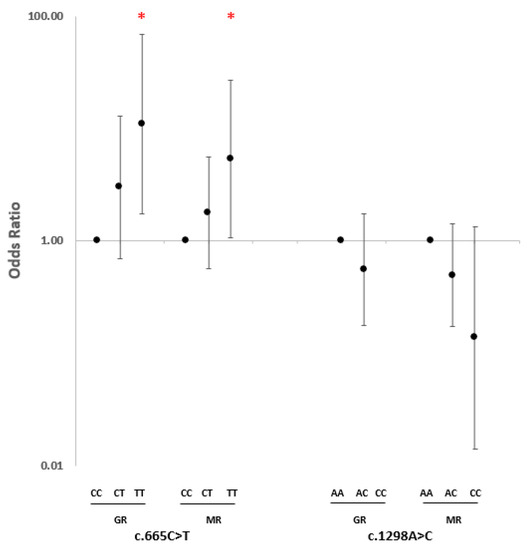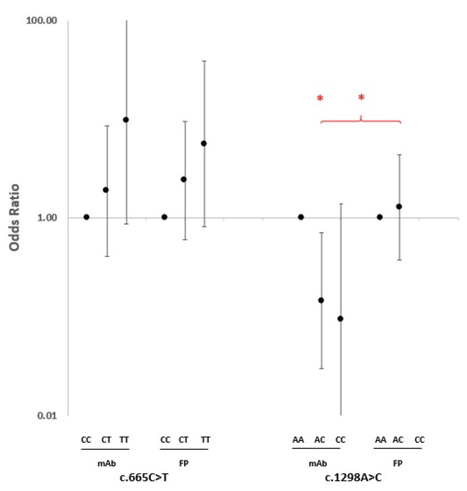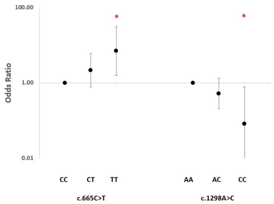 - Khalighi, K.; Cheng, G.; Mirabbasi, S.; Khalighi, B.; Wu, Y.; Fan, W. Opposite Impact of Methylene Tetrahydrofolate Reductase C677T and Methylene Tetrahydrofolate Reductase A1298C Gene Polymorphisms on Systemic Inflammation. J. Clin. Lab. Anal. 2018, 32, e22401. [Google Scholar] [CrossRef] [PubMed]