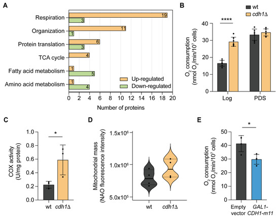 To identify the biological processes most impacted in cdh1Δ cells, a gene ontology (GO)-term enrichment analysis on biological processes was run using STRING v11.0 database [24]. This analysis showed that among the 43 up-regulated mitochondrial proteins the TCA cycle and mitochondrial respiration were the most represented processes (Figure 2A). Our results are consistent with the mitochondrial proteome analysis of yeast grown in respiratory conditions (versus fermentative) in which an overrepresentation of proteins associated to these processes have been reported [3,5,25]. We also found that proteins associated with mitochondrial protein synthesis and mitochondrial organization are enriched in the cdh1Δ mutant, namely several proteins involved in respiratory complexes assembly and two proteins involved in mitochondrial morphology, Fis1p and Dnm1p. Since both proteins are involved in fission, we analysed the mitochondrial network morphology in the cdh1Δ mutant but found no alterations in mitochondrial morphology (Figure S1). However, this was not entirely unexpected as increased Fis1p and Dnm1p abundance are also associated to the proteome remodelling that occurs upon the transition to a respiration metabolism, and this is not associated to mitochondrial fragmentation [3,25].