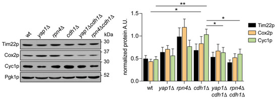 To further evaluate this functional relationship, we assessed how the deletion of RPN4 and YAP1 affected the expression of mitochondrial proteins previously identified as up-regulated (Cyc1p and Cox2p) in cdh1Δ cells. Cyc1p and Cox2p were among the proteins identified by YEASTRACT+ as potentially transcriptionally regulated by Yap1p and Rpn4p. Tim22p, which was found unaltered cdh1Δ cells, was also analysed as a control of mitochondrial mass. Accordingly, we found Cyc1p and Cox2p, but not Tim22p, accumulated at higher levels in proliferating cdh1Δ cells (Figure 4). Our results also show that Cyc1p levels were significantly decreased after deletion of both YAP1 and RPN4 in cdh1Δ cells. Cox2p levels also decreased in the double mutants when compared with cdh1Δ cells, but the difference was not statistically significant (Figure 4).