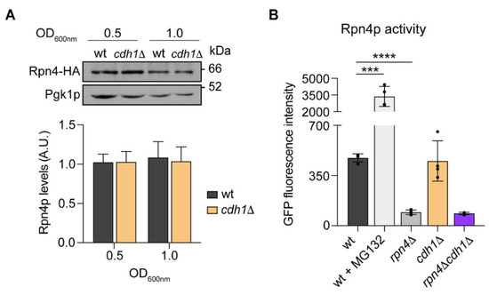 Rpn4p levels or activity are not altered in cdh1∆ mutant cells. (A) Wt or cdh1Δ cells endogenously expressing hemagglutinin (HA)-tagged Rpn4p were grown to early and mid-log phase and analyzed by immunoblotting using anti-HA and anti-Pgk1p (loading control) antibodies. A representative blot is shown. Graph represents the relative amount of Rpn4-HA normalized to Pgk1p. Values are the mean ± SEM (n = 4). (B) Cells with the indicated genotypes harboring a GFP reporter for Rpn4p activity were grown to early-log phase. As a positive control, wt cells were treated with the proteasome inhibitor MG132. The GFP fluorescence intensity was determined by flow cytometry. The values are the mean ± SD (n = 4), ***, p < 0.001; ****, p < 0.0001; t-test.