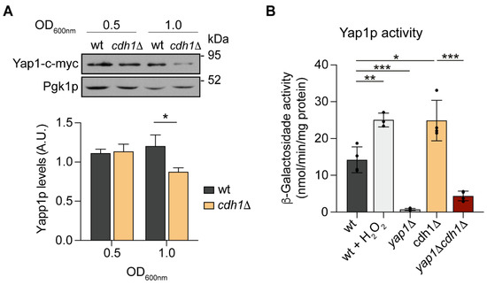 CDH1 deletion leads to Yap1p activation. (A) yap1Δ and yap1Δcdh1Δ cells harboring pRS315-Yap1-c-Myc plasmid were grown to early- and mid-log phase and total protein extracts were separated by SDS-PAGE and analyzed by immunoblotting using anti-c-myc and anti-Pgk1p. A representative blot is shown. Graph represents the relative amount of Yap1-c-myc normalized to Pgk1p. Values are the mean ± SEM (n = 4); *, p < 0.05; t-test. (B) Cells with the indicated genotypes harboring pRS415-AP-1-CYC1-LacZ reporter were grown to mid-log phase. As a positive control, wt cells were exposed to hydrogen peroxide (H2O2). The specific β-galactosidase activity was determined using o-nitrophenyl-β-d-galactopyranoside (ONPG) as a substrate. The values are the mean ± SD (n = 4), *, p < 0.05; **, p < 0.01; ***, p < 0.001; t-test.