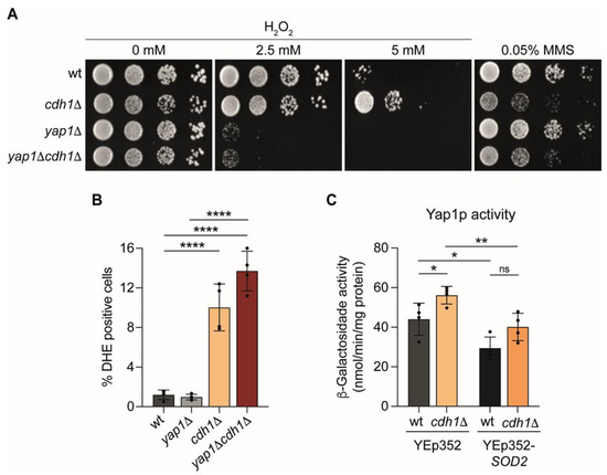 Yap1p mediates the oxidative stress resistance of the cdh1Δ strain. (A) H2O2 and methyl methanesulfonate (MMS) sensitivity of wt, cdh1Δ, yap1Δ and yap1Δcdh1Δ cells. Cells were grown until mid-log phase and ten-fold dilutions were spotted onto YPGal plates without a stressor or with 2.5–5 mM H2O2 or 0.05% MMS. Plates were incubated at 26 °C for 2 days. A representative image is shown (n = 3). (B) Cells with the indicated genotypes were grown until early-log phase and cellular ROS levels were assessed by flow cytometry using the fluorescent probe dihydroethidium (DHE). The values are the mean ± SD (n = 4), ****, p < 0.0001; one-way ANOVA followed by Tukey’s multiple-comparison test. (C) Cells with the indicated genotypes harboring pRS415-AP-1-CYC1-LacZ reporter were grown to mid-log phase. The specific β-galactosidase activity was determined using o-nitrophenol-β-d-galactopyranoside (ONPG) as a substrate. The values are the mean ± SD (n = 4), ns, not significant, *, p < 0.05; **, p < 0.01; t-test.