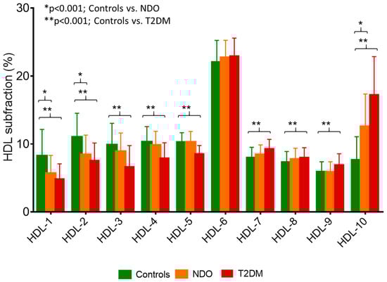 Percentage of high-density lipoprotein (HDL) subfractions in healthy lean subjects (controls; green bar; n = 49), non-diabetic obese patients (NDO; orange bar; n = 106), and patients with type 2 diabetes mellitus (T2DM; red bar; n = 62). Data are presented as mean ± standard deviation. Differences between the three study groups are analyzed using a one-way ANOVA. * indicates a p < 0.001 between controls and NDO; ** indicates a p < 0.001 between controls and T2DM. HDL subfractions were distributed by Lipoprint gel electrophoresis (Quantimetrix Corp. Redondo Beach, CA, USA) from peripheral blood serum samples.
