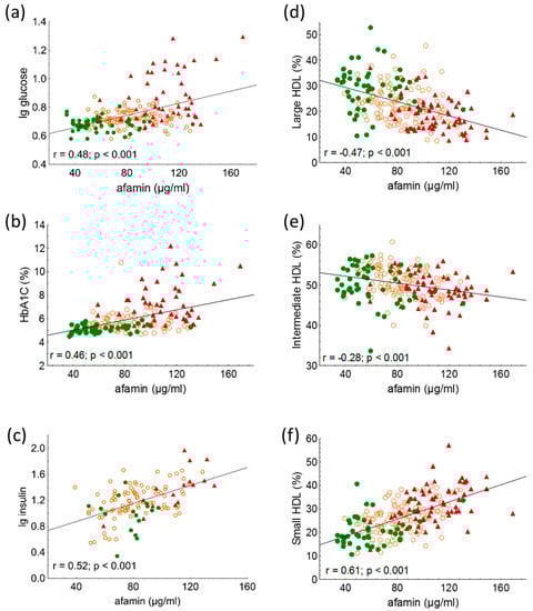 Correlations between (a) lg glucose; (b) HbA1C; (c) lg insulin; (d) percentage of large high-density lipoprotein (HDL) subfraction (HDL-1-3); (e) percentage of intermediate HDL subfraction (HDL-4-7); and (f) percentage of small HDL subfraction (HDL-8-10) and serum afamin in healthy lean subjects (controls; green color), non-diabetic obese patients (NDO; orange color), and patients with type 2 diabetes mellitus (T2DM; red color). Afamin concentrations were quantified from peripheral blood serum samples with enzyme linked immunosorbent assays, and HDL subfractions were distributed by Lipoprint gel electrophoresis.