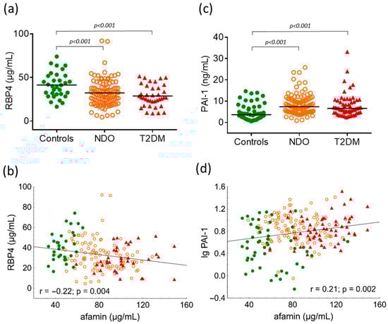 Circulating RBP4 was significantly lower in the NDO and T2DM groups than normal weight individuals (controls: 41.4 ± 14.4 μg/mL vs. NDO: 32.3 ± 15 μg/mL vs. T2DM: 28.8 ± 12.3 μg/mL; one-way ANOVA: p < 0.001) (Figure 3a). There was a negative correlation between RBP4 and afamin (r = −0.22; p = 0.004) (Figure 3b). Plasma PAI-1 was significantly higher in the NDO and T2DM groups (controls: 3.63 (1.99–7.29) ng/mL vs. NDO: 7.37 (4.94–10.42) ng/mL vs. T2DM: 6.62 (4.6–10.28) ng/mL; Kruskal-Wallis H test: p < 0.001) (Figure 3c) and a significant positive correlation can be seen between plasma PAI-1 and afamin in overall subjects (r = 0.21; p = 0.002).