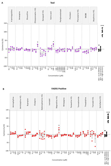 The FAERS-positive and FAERS-negative compounds and even some of the tool compounds (pilocarpine, pentylenetetrazol, 4-aminopyridine, chlorpromazine, amoxapine, and donezepil) are administered clinically to treat various diseases in the brain or peripheral tissues or for diagnostic purposes. Consequently, defining the optimal concentration for in vivo gene expression studies in neuronal cell cultures of this heterogeneous list of compounds was challenging [30,31]. First, the dose selection was guided by the information available on the therapeutic plasma concentrations. Second, we tested the neurotoxicity of each compound around the therapeutic concentration range and selected the highest tolerated concentration in our assay, as our preliminary studies with 4-aminopyridine, bupropion, kainic acid, and pentylenetetrazol indicated that the drug-induced gene expression was highly concentration-dependent.