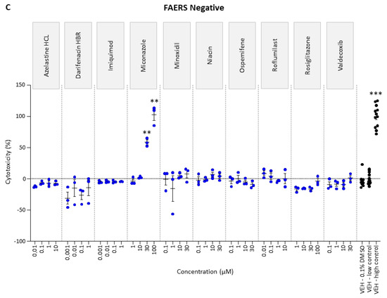The 11 FAERS-negative compounds induced a total of 206 pathways. The exposure of cultures to azelastine, imiquimod, miconazole, minoxidil, roflumilast, rosiglitazone, or valdecoxib resulted in enriched pathways. Darifenacin, niacin, and ospemifene, however, showed no enrichment.