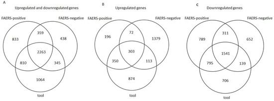 Venn diagrams show 2263 common DE genes between the tool, FAERS-positive, and FAERS-negative compounds when both the upregulated and downregulated genes were included in the analysis (Figure 2A). If only the upregulated DE genes were included, 303 DE genes were common to all the compound categories (Figure 2B). If only the downregulated DE genes were included, 1541 DE genes were common to all the compound categories (Figure 2C).