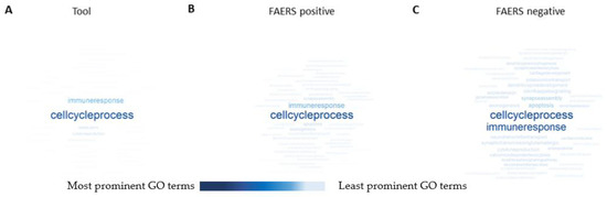 The most prominent gene ontology (GO) terms of the (A) tool, (B) FAERS-positive, and (C) FAERS-negative compounds in a word cloud. The most frequent GO terms have the largest font size and the darkest blue color. In all the compound categories, “cell cycle process” was the most common GO term. In FAERS-positive and FAERS-negative categories, “apoptosis” was also prominent. See Supplementary File S2.