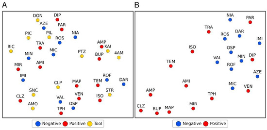 A 2-dimensional illustration of the UMAP reductions of the normalized rank-transformed replicate means of RNA-seq normalized read counts. (A) No clustering by compound category (tool, FAERS-positive, FAERS-negative compounds) is apparent. (B) A similar reduction for the vectors of a number of differentially expressed genes by FAERS-positive and FAERS-negative with a positive fold-change shared with each tool compound. Abbreviations: The 11 tool compounds: 4-aminopyridine (4AM), amoxapine (AMO), bicuculine (BIC), chlorpromazine (CPL), donepezil (DON), kainic acid (KAI), picrotoxin (PIC), pilocarpine (PIL), pentylenetetrazol (PTZ), strychnine (STR), and SNC80 (SNC). The 13 FAERS-positive compounds: amitriptyline (AMI), aminophylline (AMP), bupropion (BUP), clozapine (CLZ), diphenhydramine (DIP), isoniazid (ISO), maprotiline (MAP), mirtazapine (MIR), paroxetine (PAR), temozolomide (TEM), theophylline (TPH), tramadol (TRA), and venlafaxine (VEN). The 10 FAERS-negative compounds: azelastine (AZE), darifenacin (DAR), imiquimod (IMI), miconazole (MIC), minoxidil (MIN), niacin (NIA), ospemifene (OSP), rosiglitazone (ROS), roflumilast (ROF), and valdecoxib (VAL).
