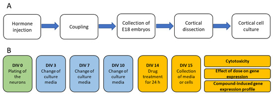 Production of embryos and set-up of cell cultures. (A) Production of embryos for the rat primary cortical cell cultures. (B) Treatment of cell cultures for the assessment of compound-induced cytotoxicity, dose-optimization, and compound-induced gene expression.
