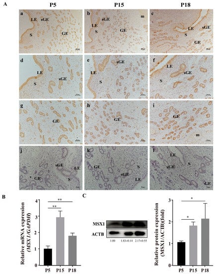 Representative images of MSX1 immunolocalization and expression in goat endometrial tissue at pregnancy at days 5, 15, and 18. (A) Representative images of MSX1 immunolocalization in goat endometrial tissue at pregnancy at days 5, 15, and 18: (a,d,g) MSX1 immunolocalization in goat endometrial tissue on P5 (n = 3); (b,e,h) MSX1 immunolocalization in goat endometrial tissue on P15 (n = 3); (c,f,i) MSX1 immunolocalization in goat endometrial tissue on P18 (n = 3); (j–l) negative control in goat endometrial tissue on P5, P15, and P18. (B) The mRNA expression level of MSX1 in P5, P15, and P18. (C) Western blot and analysis of MSX1 protein in P5, P15, and P18. LEs: luminal epithelial cells; sGE: superficial glandular epithelium; GEs: glandular epithelial cells; S: stromal cells; m: myometrium. (a–c) scale bar = 200 μm; (d–l) scale bar = 50 μm. * p < 0.05; ** p < 0.01.