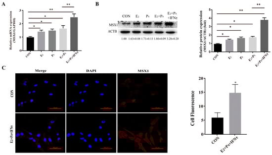 To further explore the biological function of MSX1, the gEECs were treated with E2, P4, and/or IFNτ to mimic the intrauterine environment during the peri-implantation period. The expression of MSX1 in the gEECs was detected with E2, P4, and/or IFNτ treatments. The results showed that the expression of MSX1 was upregulated in the E2, P4, E2 + P4, and E2 + P4 + IFNτ groups compared with the control group, and the upregulation in the E2 + P4 + IFNτ group was more significant than the other groups (Figure 2A,B, p < 0.01). Furthermore, MSX1 was localized abundantly in the cytoplasm and nucleus of the gEECs under E2, P4, and IFNτ treatment compared to the control group, and the fluorescence was upregulated (Figure 2C, p < 0.05). These results indicate that MSX1 was induced in the gEECs by E2 and P4 and was further enhanced with IFNτ treatment.