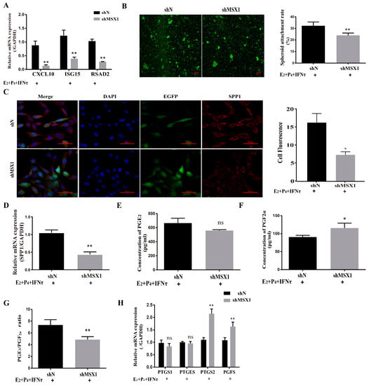 Knockdown of MSX1 affected endometrial adhesion and secretory function. (A) mRNA expression level of uterine receptivity markers (ISG15, CXCL10, and RSAD2) in the shN group and shMSX1 group; (B) representative images and analysis of GTC spheroids in the shN group and shMSX1 group, scale bar = 50 μm; (C) representative images and analysis of SPP1 expression in the shN group and shMsx1 group, scale bar = 50 μm; (D) mRNA expression level of SPP1 in the shN group and shMSX1 group; (E,F) secretion of PGE2 and PGF2α in the shN group and shMSX1 group; (G) ratio of PGE2/PGF2α in the shN group and shMSX1 group; (H) mRNA expression level of the PGs synthesis genes in the shN group and shMSX1 group. ns: p > 0.05; * p < 0.05; ** p < 0.01.